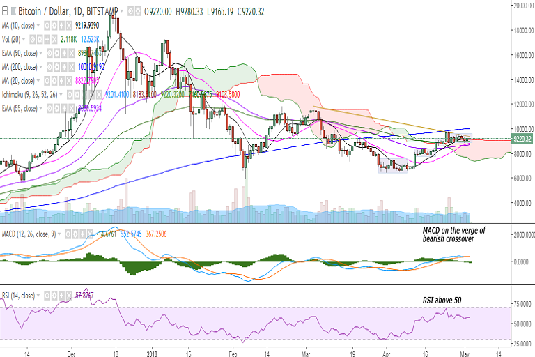 BTC/USD is extremely rangebound on Thursday as it faces resistance at 9451 (trend line joining 11688 and 9755.53). It is currently trading at 9213 levels at press time (Bitstamp).