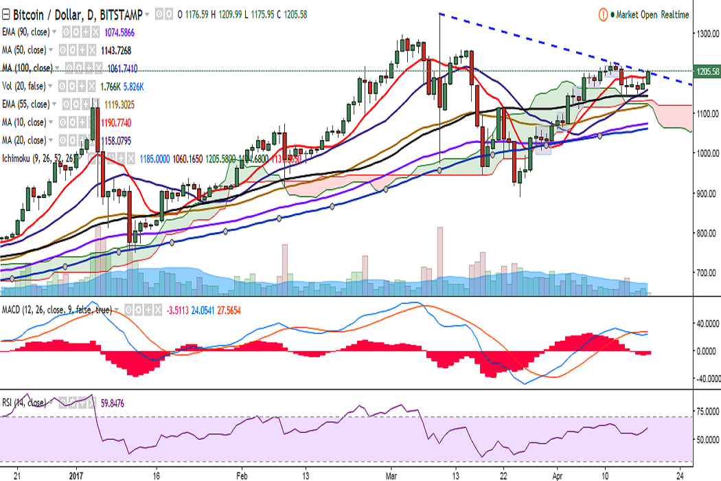 BTC/USD broke above 10-DMA on Tuesday and is currently holding its strength above this level. It is currently trading at 1204 levels (Bitstamp).
