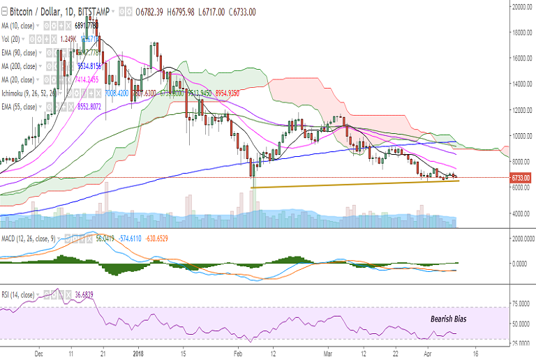 BTC/USD failed to hold above 10-DMA and closed in the red at 6611 levels on Monday. The pair is currently trading at 6733 levels at the time of writing (Bitstamp).