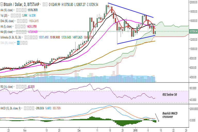 On the flipside, a break below 12800 (January 11 low) would see the pair testing 12610 (Cloud bottom)/12430 (lower Bollinger). Further weakness would drag the pair to 12050 (December 30 low)/11631 (90-EMA).