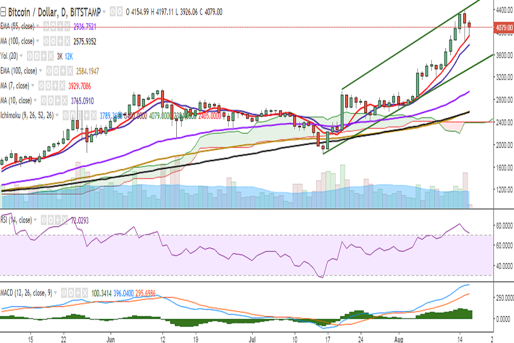 BTC/USD plummeted to 3800 levels on Tuesday before it closed at 4155 levels. It continues trading in the red at 3991 levels at the time of writing (Bitstamp).