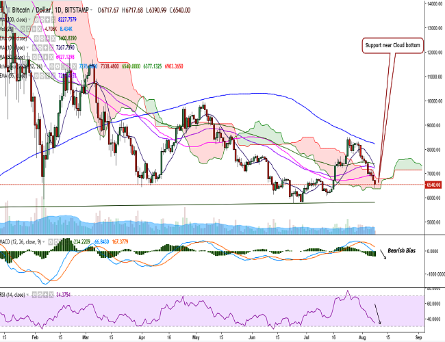 The pair is over 4 percent down so far in the day and currently trading at 6540 levels at the time of writing (Bitstamp).