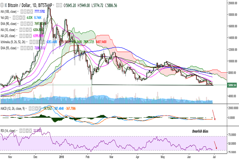 BTC/USD closed below 6000 levels on Thursday and is currently trading at 5879 levels at the time of writing (Bitstamp).