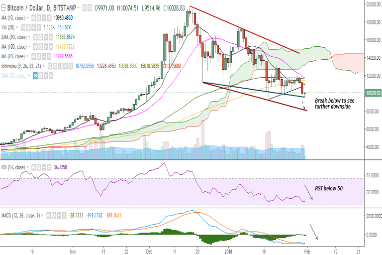 BTC/USD broke below the trend line support on Tuesday and dropped to 9514 levels. It is currently trading at 9990 levels at the time of writing (Bitstamp).