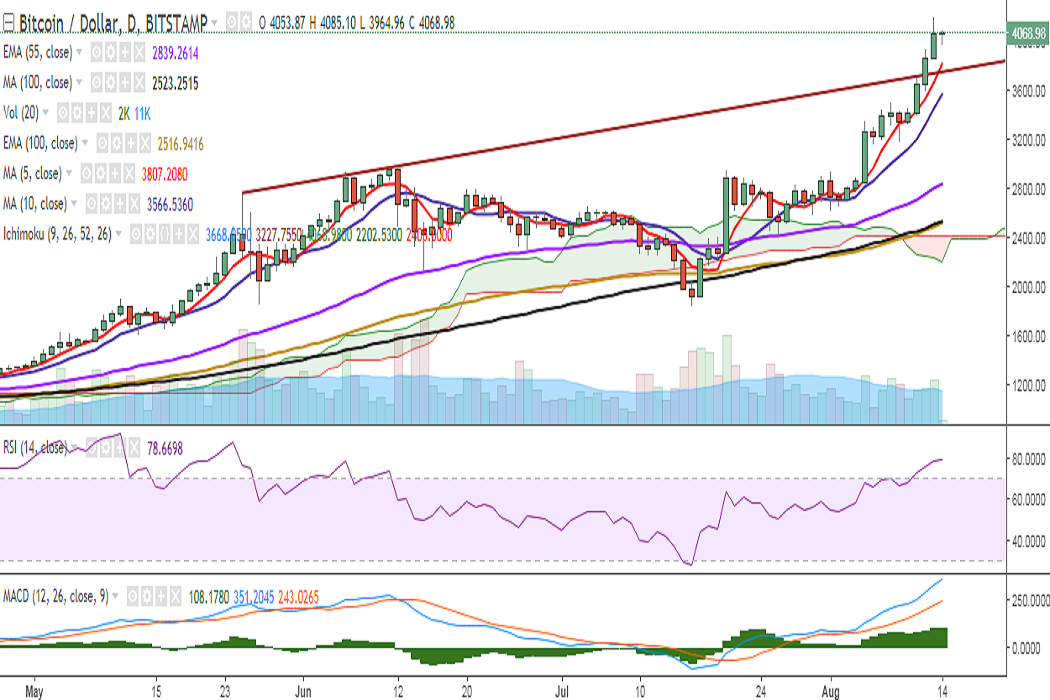 BTC/USD crossed the 4000 mark and hit a fresh all-time high at 4190 levels on August 13th. The pair is currently trading at 4060 levels at the time of writing (Bitstamp).