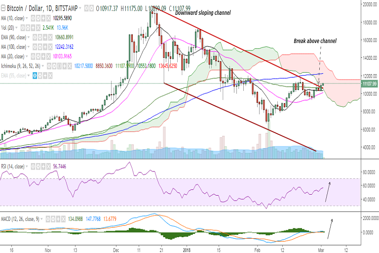 BTC/USD is trading tad higher on Friday as it broke above the channel top. It is currently trading at 11100 levels at the time of writing (Bitstamp).