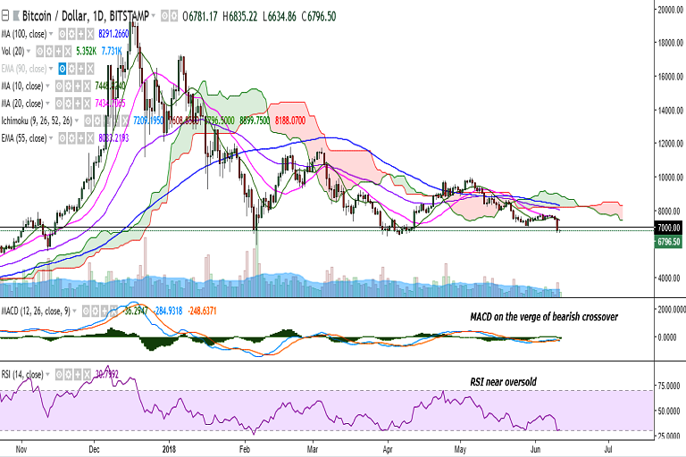 BTC/USD plunged to 6627 levels (two-month low) on June 10 following reports on the hack of South Korean crypto exchange Coinrail. It is currently trading at 6788 levels at the time of writing (Bitstamp).