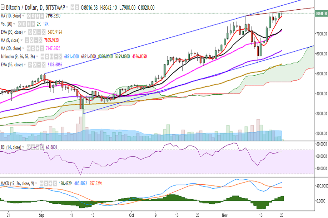 BTC/USD hit a fresh all-time high at 8087 levels on November 19 as it continued its upward trend. It is currently hovering around 8000 levels at the time of writing (Bitstamp).