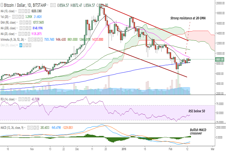 BTC/USD continues to consolidate in a close range on Wednesday as it faces strong resistance at 20-DMA. It is currently trading at 8846 levels at the time of writing (Bitstamp).