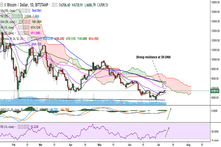 BTC/USD continues to hold its strength above 6500 levels and is currently trading at 6721 levels at press time (Bitstamp).
