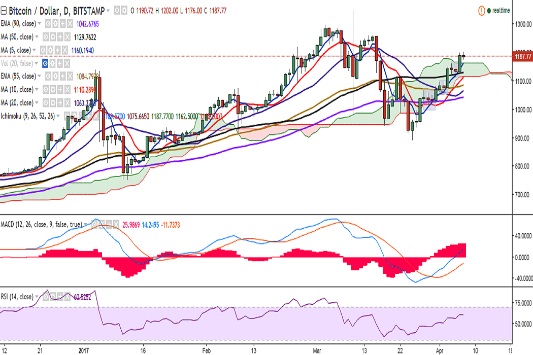 BTC/USD broke above Ichimoku Cloud on Thursday and hit 1201 levels. The pair is largely unchanged today around 1190 levels at the time of writing (Bitstamp).