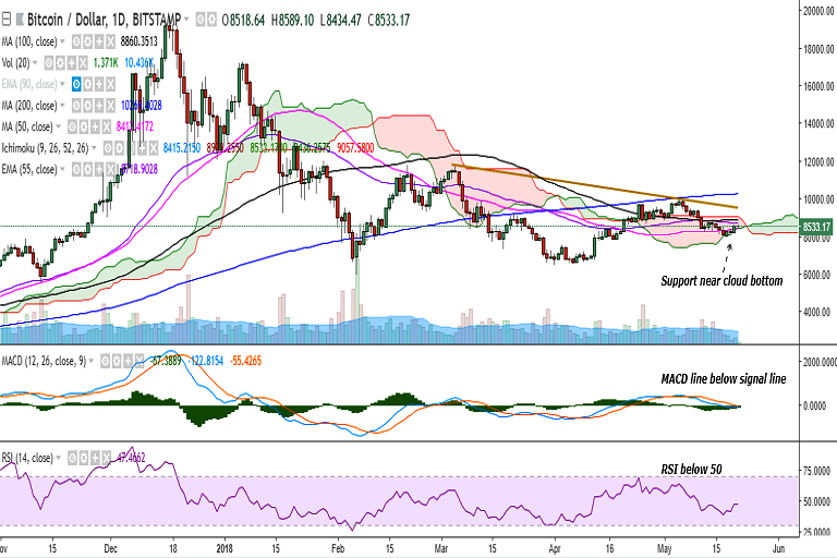 BTC/USD is consolidating in a narrow range inside Ichimoku cloud as it found a strong support near cloud bottom. It is currently trading at 8551 levels at the time of writing (Bitstamp).