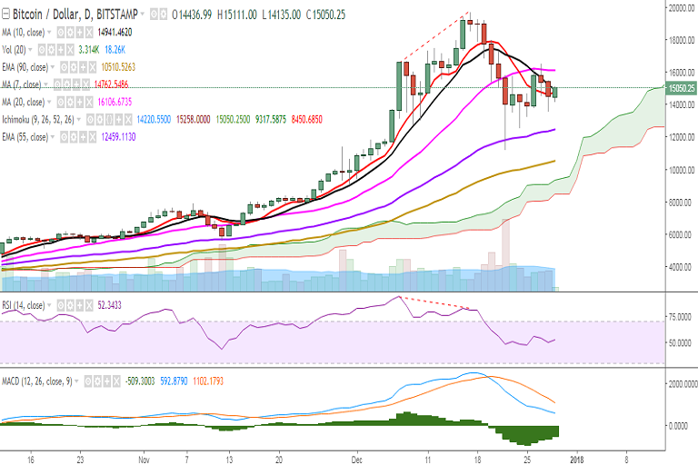 BTC/USD is trading in the green on Friday after it dropped to 13500 levels on December 28. It is currently trading at 14949 levels at the time of writing (Bitstamp).