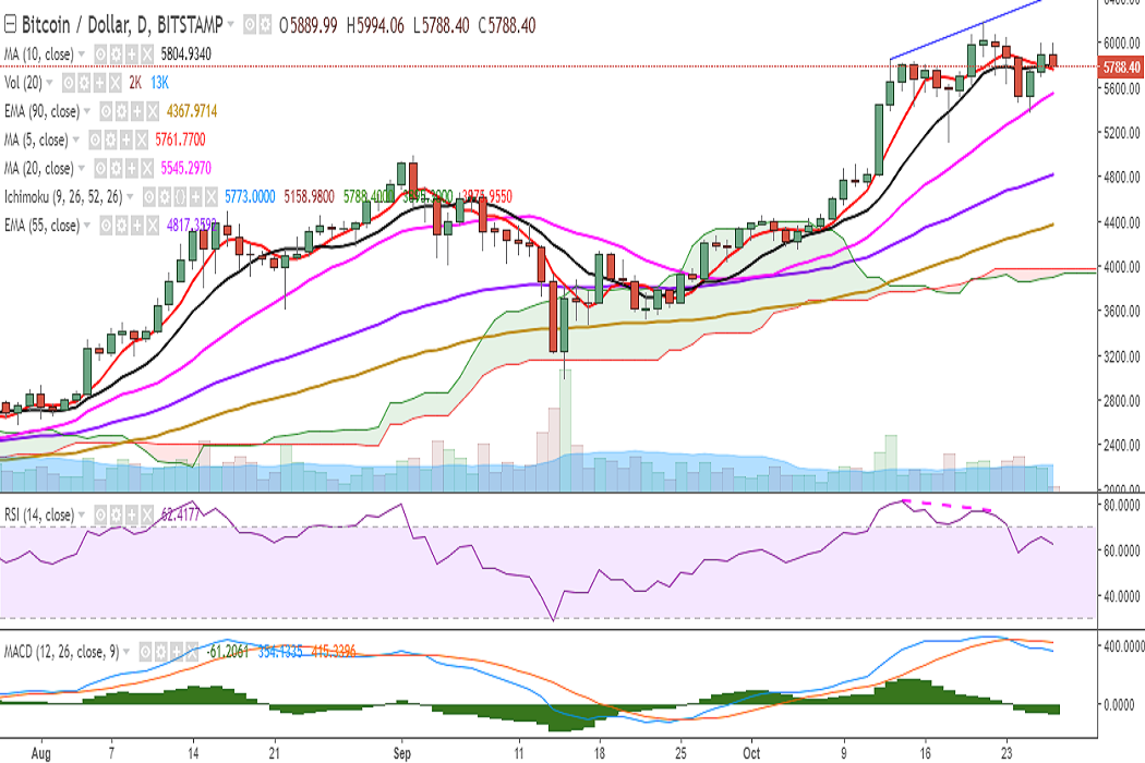 BTC/USD traded higher on Thursday and closed above 10-DMA at 5890 levels. It is currently trading at 5801 levels at the time of writing (Bitstamp).