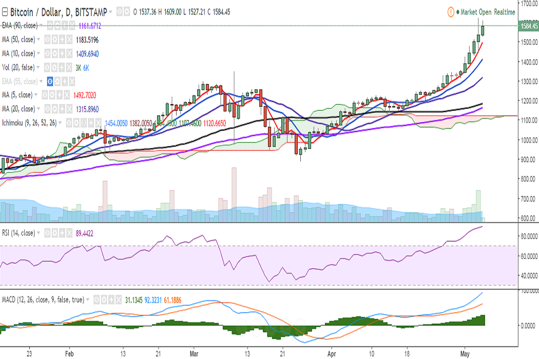 BTC/USD hit a fresh all-time high at 1623 levels on Thursday, before it closed at 1537 levels. It is currently hovering around 1600 levels at the time of writing (Bitstamp).