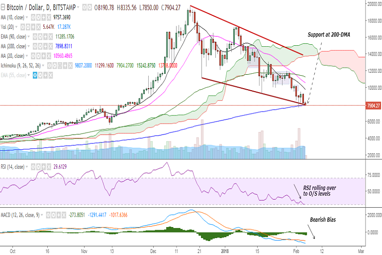 BTC/USD broke below the 8000 mark and dropped to 7625 levels on February 02. It is currently trading at 7915 levels at the time of writing (Bitstamp).