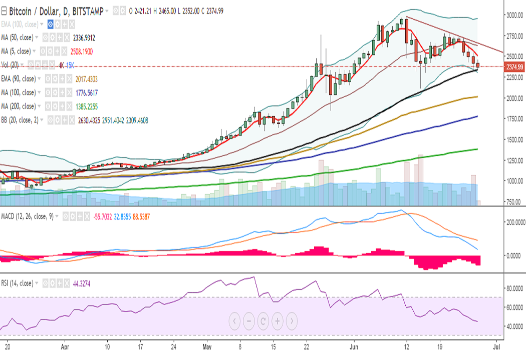 BTC/USD is continuing its downtrend on Tuesday as its upside is capped by 5-DMA. It is currently trading at 2384 levels at the time of writing (Bitstamp).