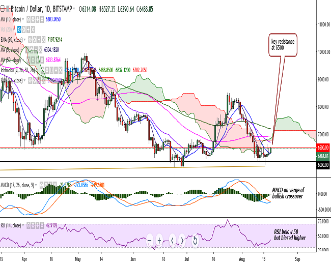 A decisive break above 6500 levels, along with other bullish indicators, could see further jump in the pair. Further bullishness would be confirmed only on a break above cloud.