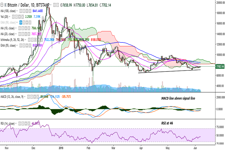 BTC/USD continues to consolidate in a narrow range and is trying to hold above 20-DMA. It is currently trading at 7703 levels at the time of writing (Bitstamp).
