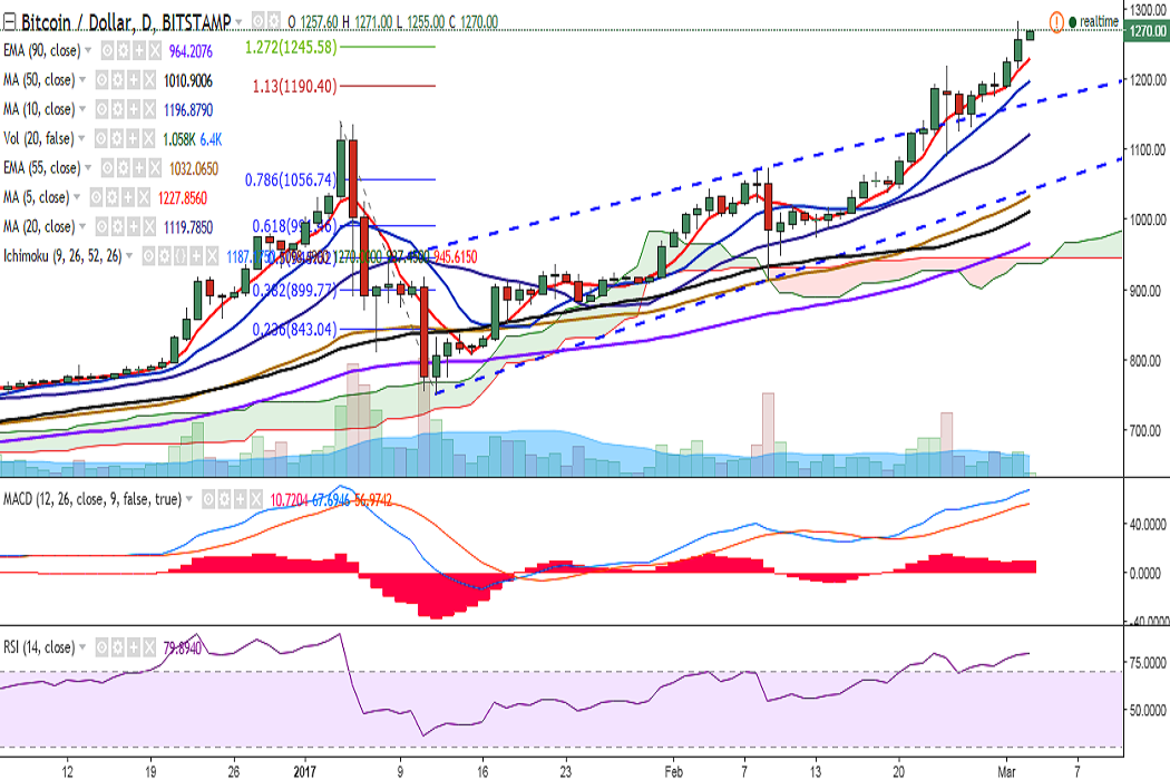 BTC/USD hit a fresh all-time high of 1283.25 levels on Thursday, before closing at 1257 levels. Today, the pair is trading in a close range between 1255 and 1270 levels (Bitstamp).