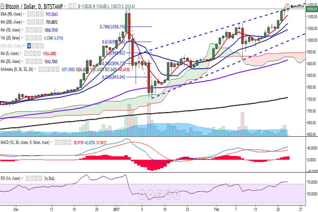 BTC/USD hit a fresh high of 1143 levels on Wednesday, for it closed at 1130 levels. The pair is struggling for a close above the trend line joining 941.81 and 1074.69 and continues to hover around this level. It is currently trading at 1131 levels at press time (Bitstamp).