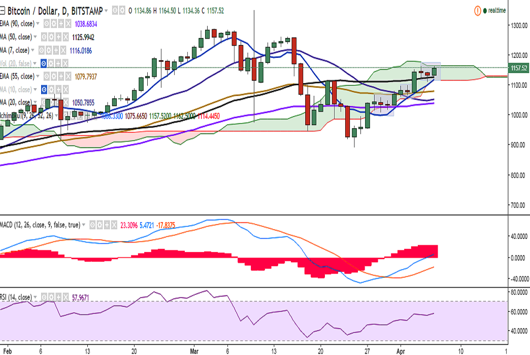 BTC/USD continues to trade in a bullish flag pattern on Thursday, with upside capped by cloud top. It is currently trading at 1158 levels at the time of writing (Bitstamp).