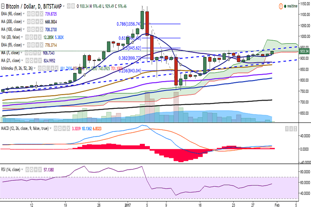 BTC/USD is moving higher after trading rangebound from the past couple of days. It is currently trading at 934 levels, just shy of trend line joining 628.99 and 745.19 (Bitstamp).