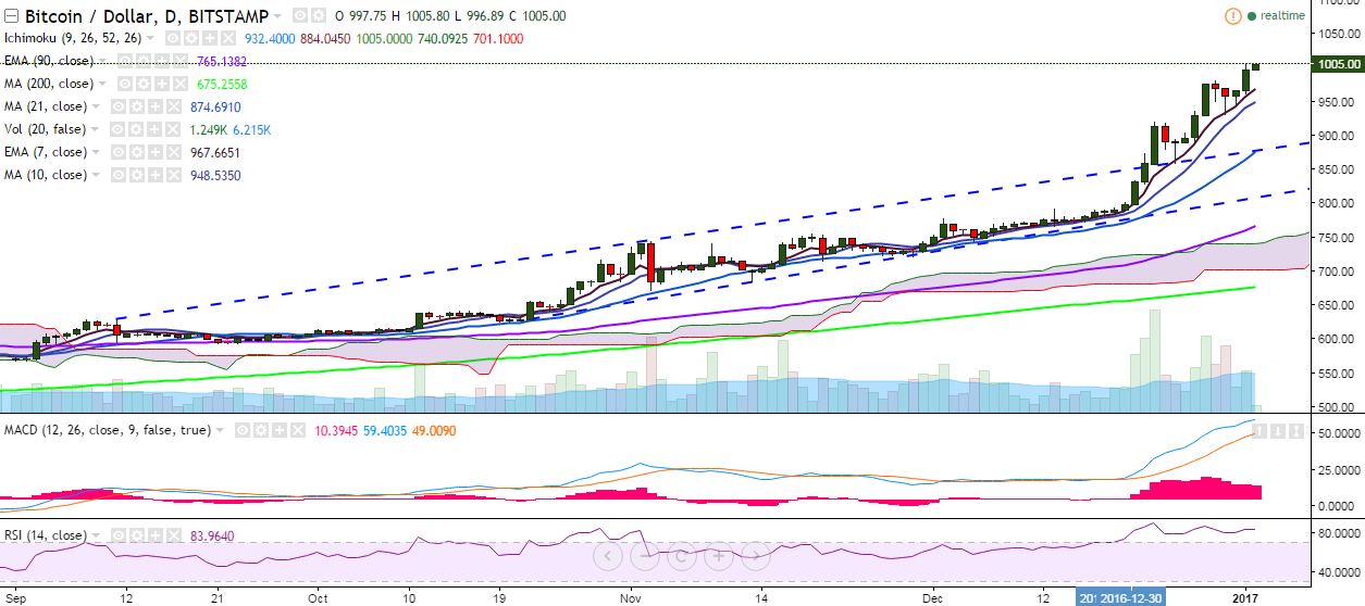 BTC/USD has a fantastic start to the New Year as it broke above the 1,000 mark and has hit 1,005 levels so far and is hovering around this level (Bitstamp).