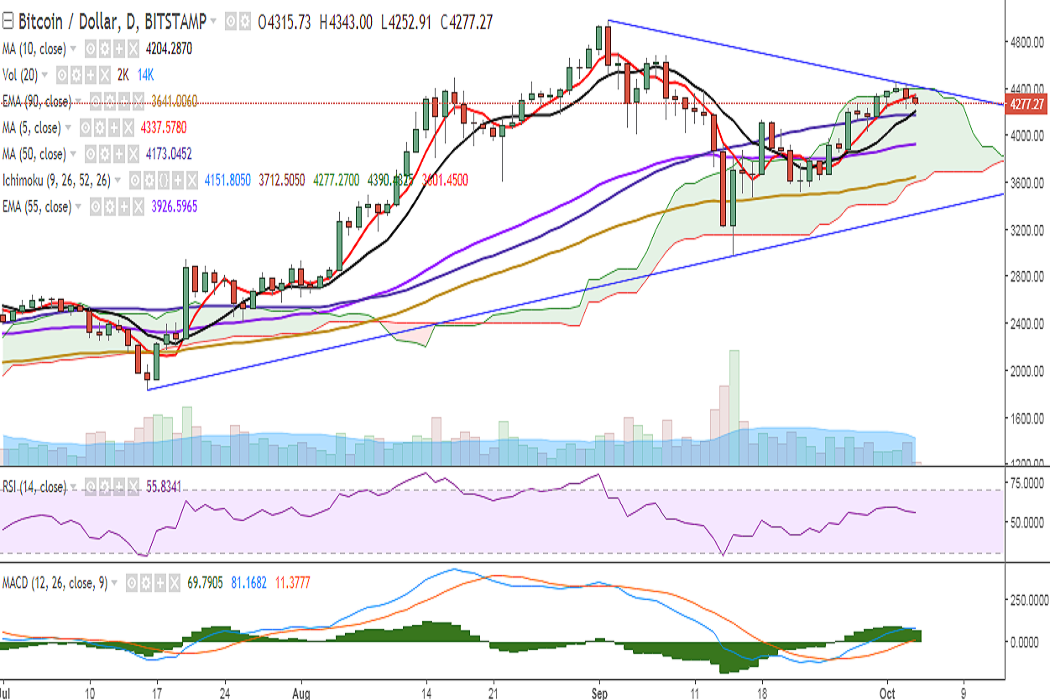 BTC/USD is trading in a tight range on Wednesday as it struggles to break above 5-DMA. It is currently trading at 4272 levels at the time of writing (Bitstamp).