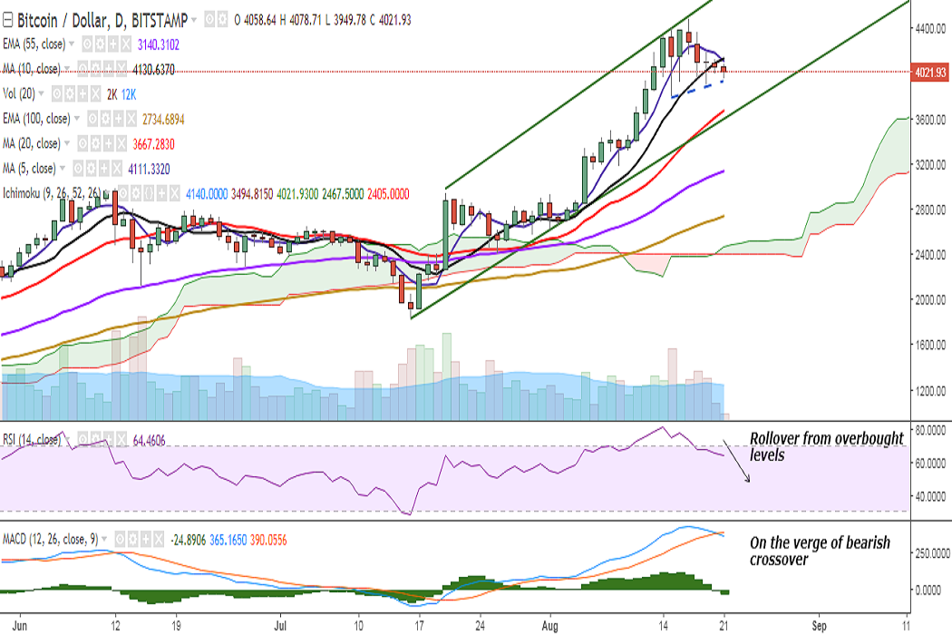 BTC/USD plummeted to 3900 levels after it hit a fresh all-time high at 4480 levels on July 17. It continues to trade in the red on Monday around 4000 levels at the time of writing (Bitstamp).