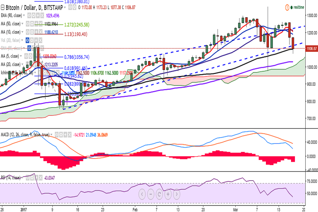 On the flipside, a close below 1099 levels (50-DMA) would further drag the pair till 1027.72 (90-EMA). Further weakness would suggest trend reversal and could see a dip till 980 (61.8% retracement of 751.34 and 1350).