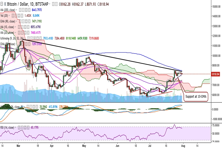 BTC/USD fell to 7853 levels on Monday before closing at 8160 levels (Bitstamp).