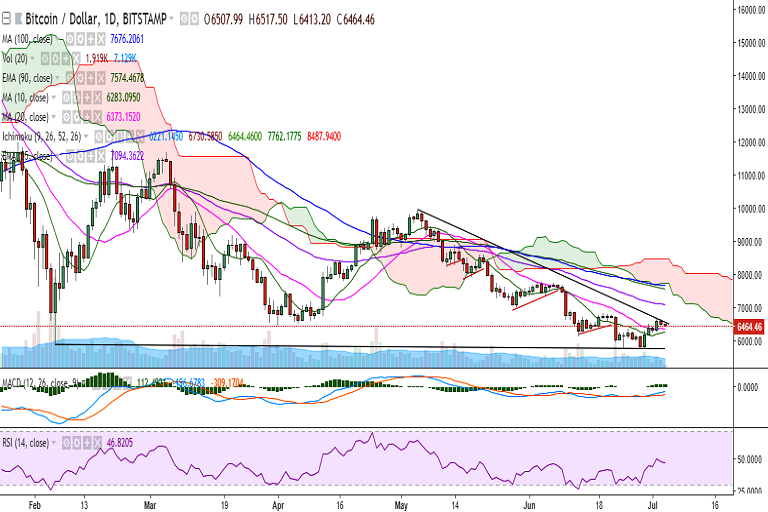 BTC/USD is trading tad lower on Wednesday as it stopped short of key resistance at 6750 (4h 200-SMA). It is currently trading in a close range below 6500 levels at the time of writing (Bitstamp).
