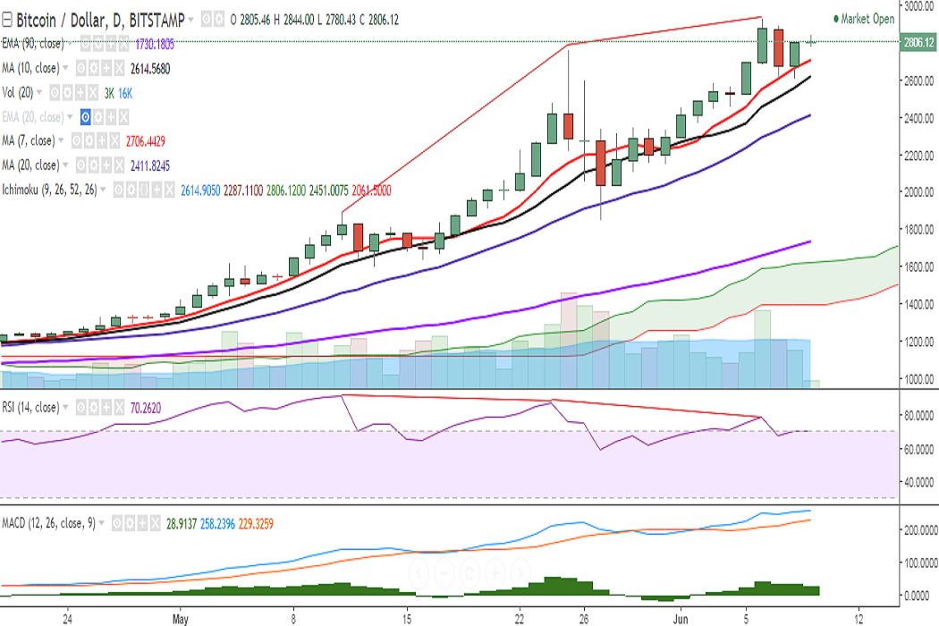 BTC/USD is trading in a narrow range on Friday, after it closed well above 5-DMA at 2806 levels on June 08. It is currently trading at 2812 levels at the time of writing (Bitstamp).