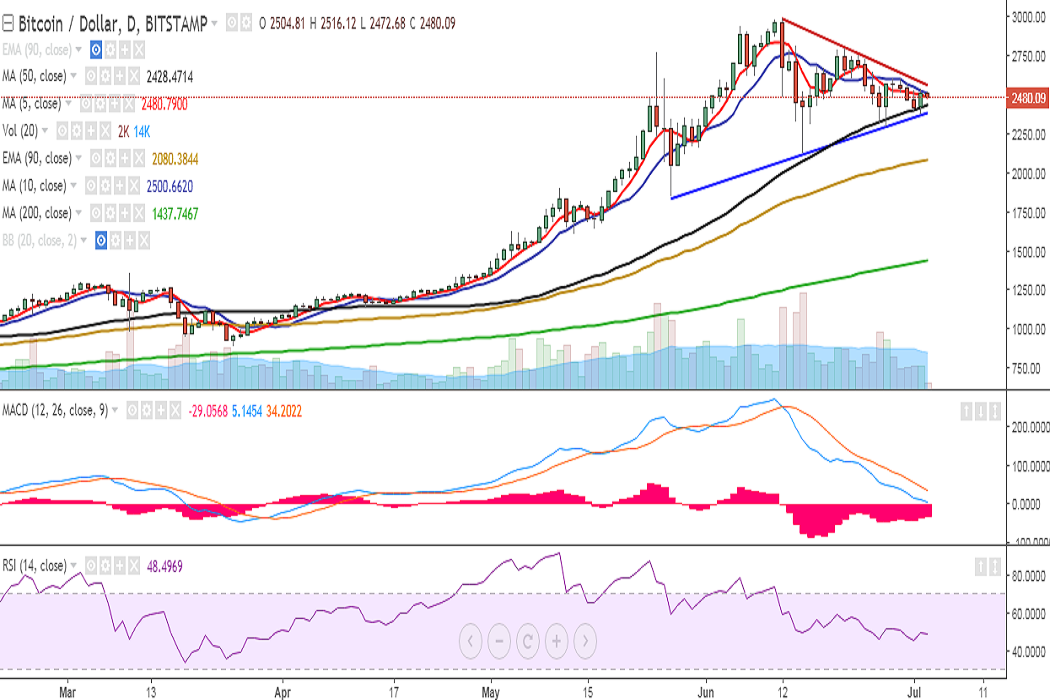 BTC/USD continues trading in a tight range in a symmetrical triangle pattern on Monday. It is currently trading at 2484 levels at the time of writing (Bitstamp).