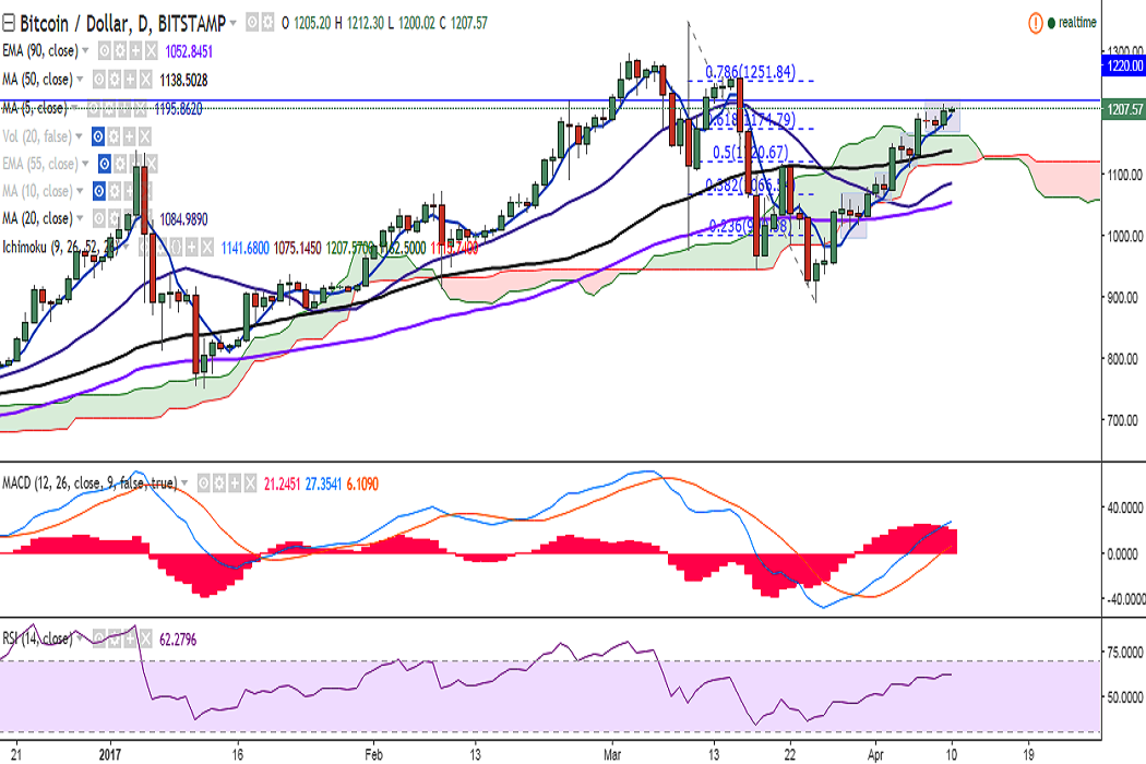 BTC/USD is trading extremely rangebound today between 1200 and 1212 levels, after it hit 1216.87 levels on April 09. It is currently trading at 1203 levels at the time of writing (Bitstamp).