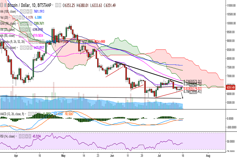 BTC/USD is extremely rangebound on Monday with its upside capped by 20-DMA. It is currently trading at 6351 levels at the time of writing (Bitstamp).