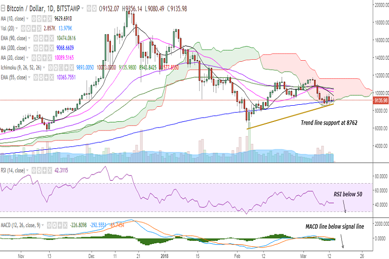 BTC/USD is trading in a narrow range on Wednesday as it struggles for a decisive break above 7-DMA. It is currently trading at 9167 levels at the time of writing (Bitstamp).