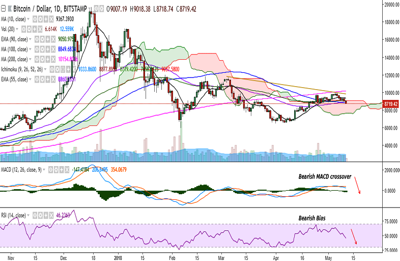 BTC/USD is trading lower on Friday as it slipped back into the cloud. It is currently trading at 8831 levels at the time of writing (Bitstamp).