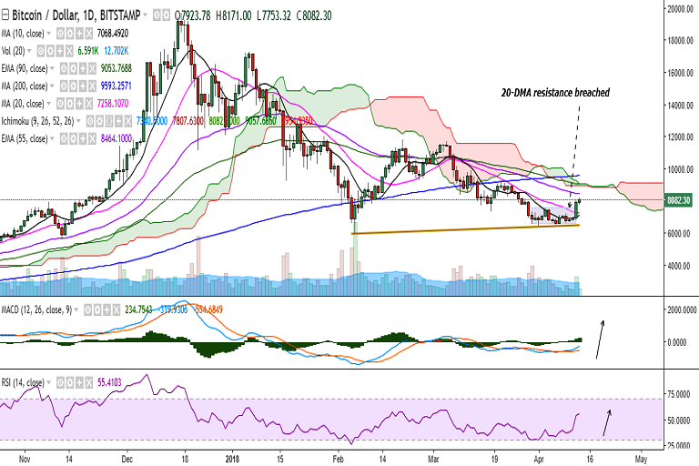 BTC/USD is trading higher on Friday as it broke above 20-DMA. It is holding above 8000 levels at 8131 levels at the time of writing (Bitstamp).