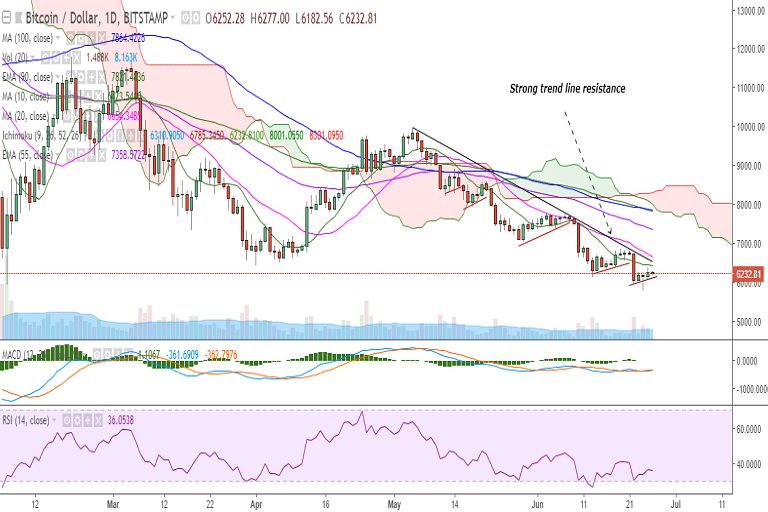 BTC/USD has recovered slightly from the 7-month low of 5780 levels hit on June 24. It is currently trading at 6234 levels at the time of writing (Bitstamp).
