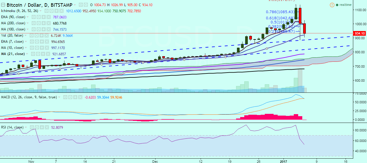 BTC/USD continues to trade in the red on Friday at it failed to break above 1,140 levels. It has broken below 1,000 levels and is currently trading at 931 levels at press time (Bitstamp).