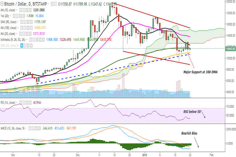 BTC/USD is trading in a close range on Monday as its upside is capped by 90-EMA. It is currently trading at 11592 levels at the time of writing (Bitstamp).