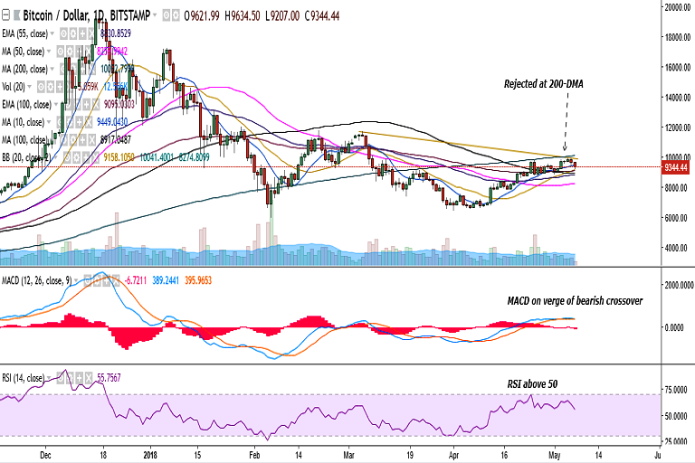BTC/USD is trading lower on Monday after it got rejected at 200-DMA. It is currently trading at 9351 levels at the time of writing (Bitstamp).