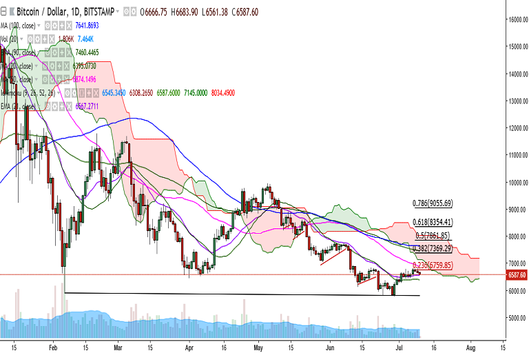 BTC/USD is trading lower on Tuesday as it failed to close above 23.6% retracement of 9948.98 and 5774.72. It is trading at 6600 levels at press time (Bitstamp).