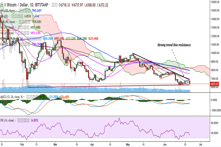 BTC/USD is trading deep in the red at 6345 levels as it failed to break above trend line joining 9948.98 and 7750 (Bitstamp).