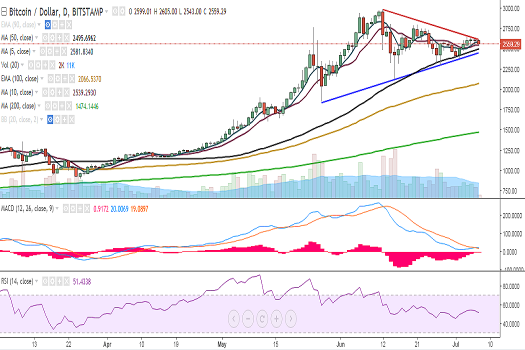 BTC/USD continues trading in a narrow range on Friday as it struggles to break above 4h 200-SMA. It is currently trading at 2555 levels at the time of writing (Bitstamp).