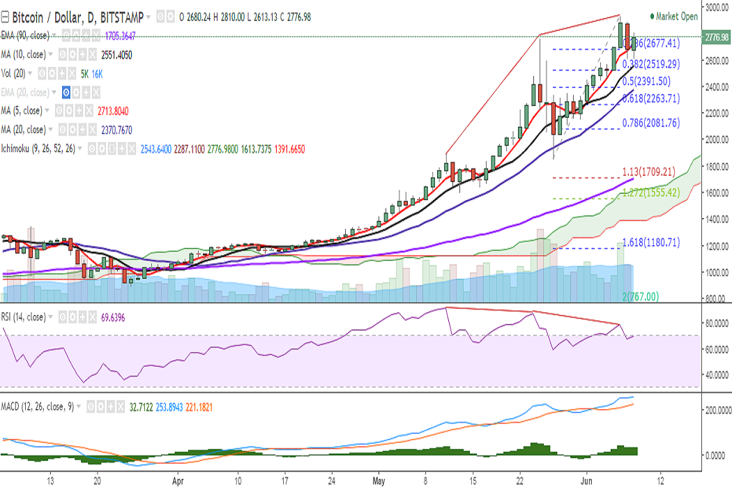 BTC/USD dropped to 2612.50 levels on Wednesday, before it managed to close just above 5-DMA at 2683 levels. Currently, the pair is holding above 5-DMA and is trading at 2785 levels at the time of writing (Bitstamp).