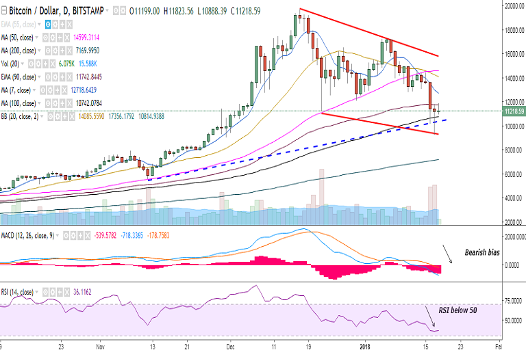 BTC/USD dropped to 9222 levels on Wednesday after it broke below trend line support at 10240. However, it managed to close at 11191 levels and is currently trading at 11262 levels at the time of writing (Bitstamp).