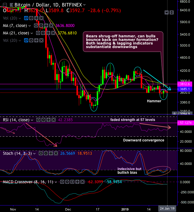 As a result, BTCUSD has been trading in a sideways trend for the day after sliding below $3,600 mark amid growing apprehensions, especially on regulatory grounds. Technically, the pair has formed a hammer pattern at $3,639.10 levels. However, bears seem to be shrugging-off this bullish pattern candlestick, while both leading & lagging indicators substantiate indecisiveness in the minor trend.